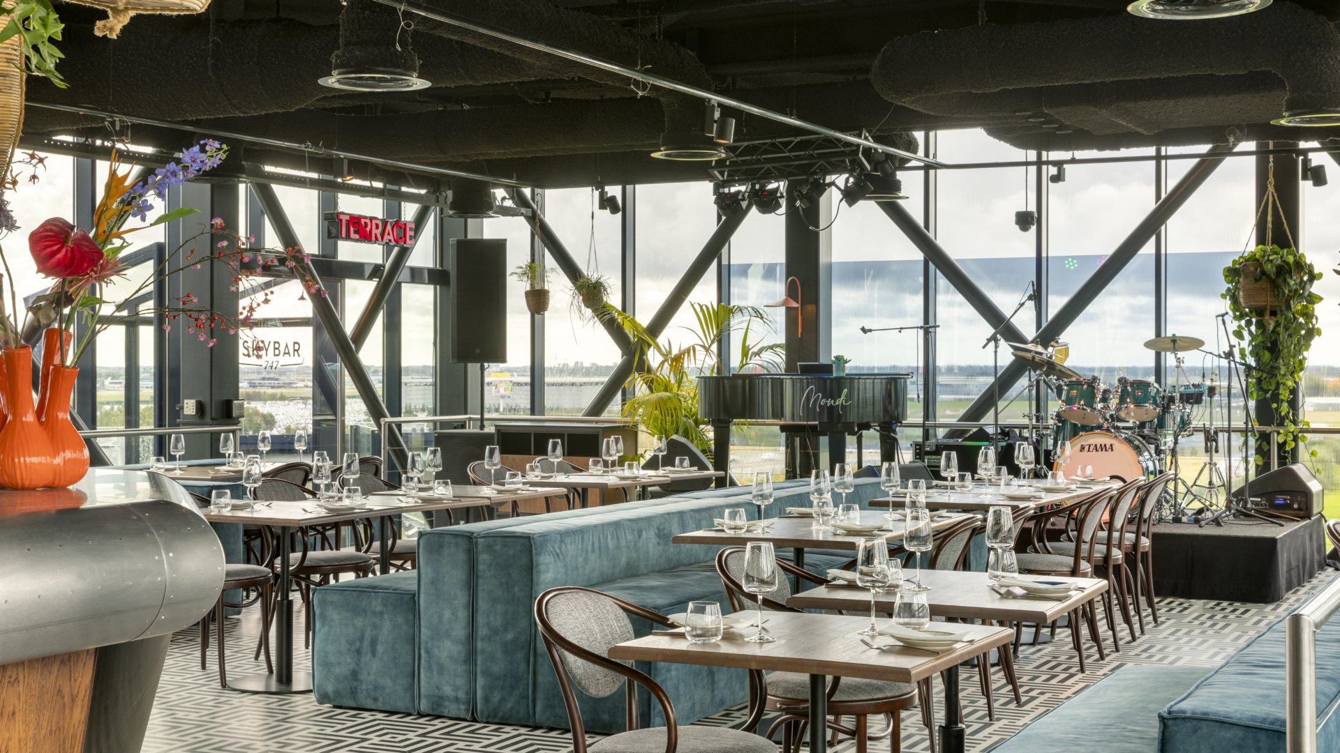 Welkom bij Mondi SkyBar & Restaurant, waar entertainment en uitzicht samenkomen. Geniet van Caribische gerechten, jazzy en soulvolle beats en een adembenemend panorama over Amsterdam, Badhoevedorp en Haarlem. Op het dakterras proost u met een cocktail terwijl vliegtuigen voorbijglijden in de avondlucht.